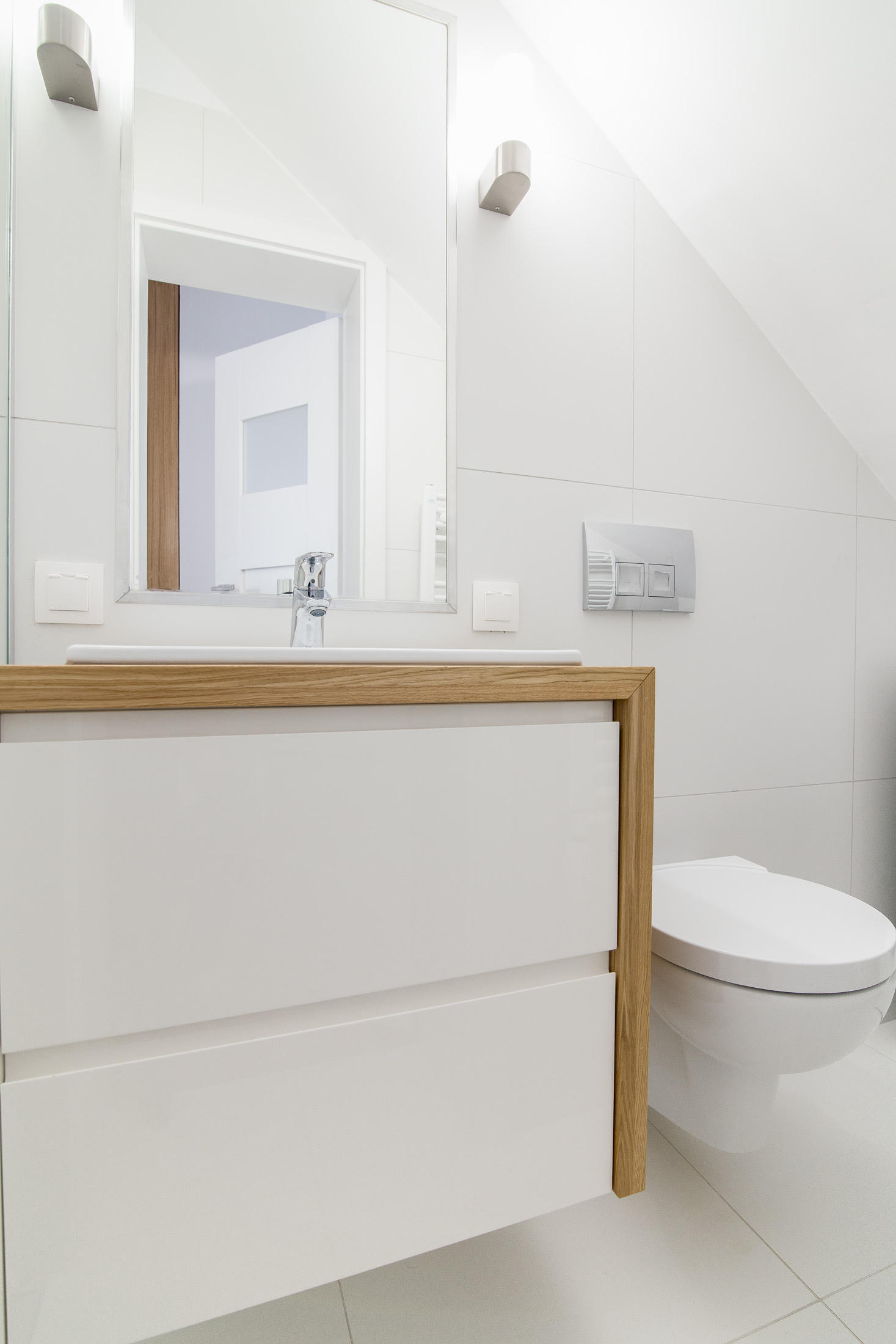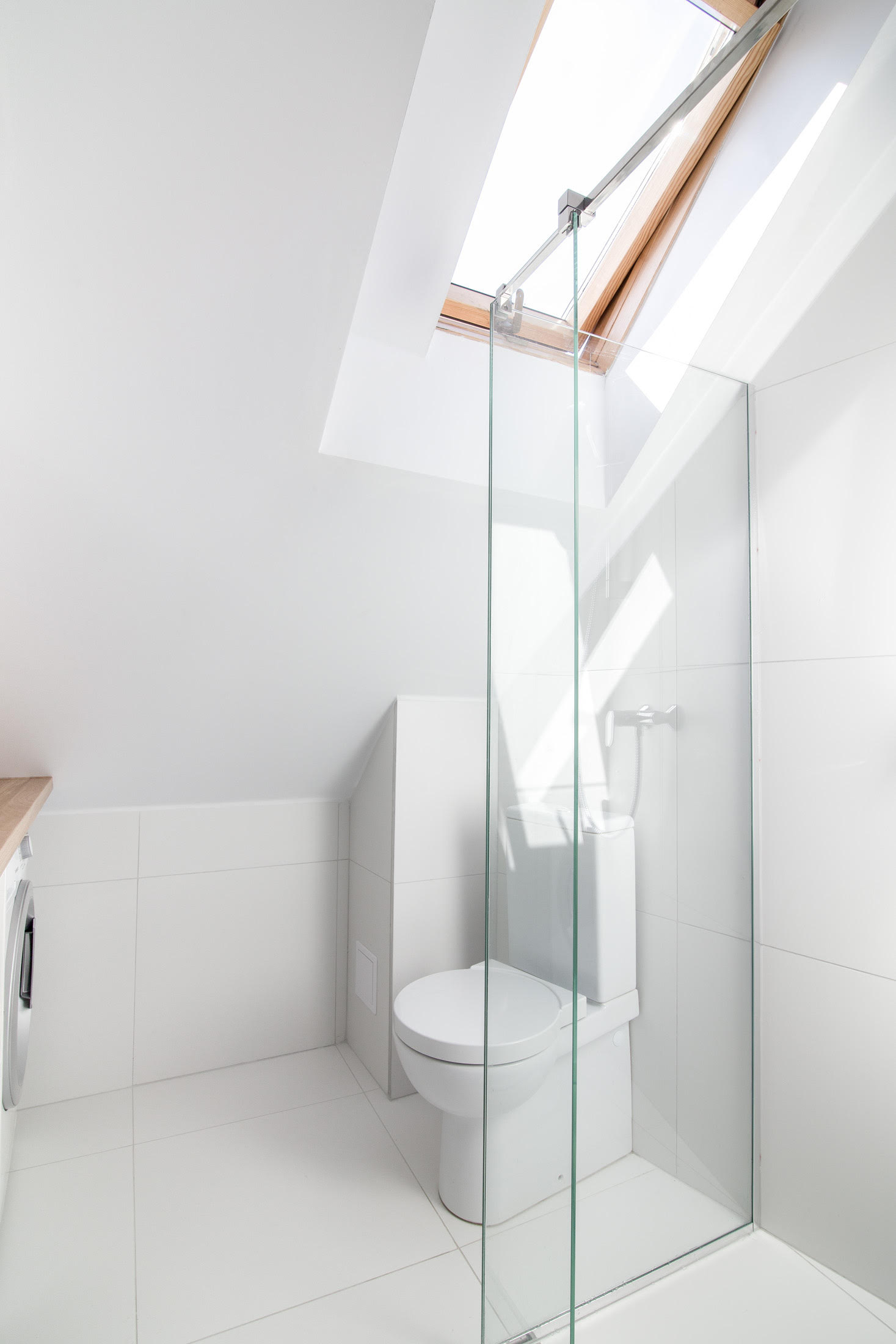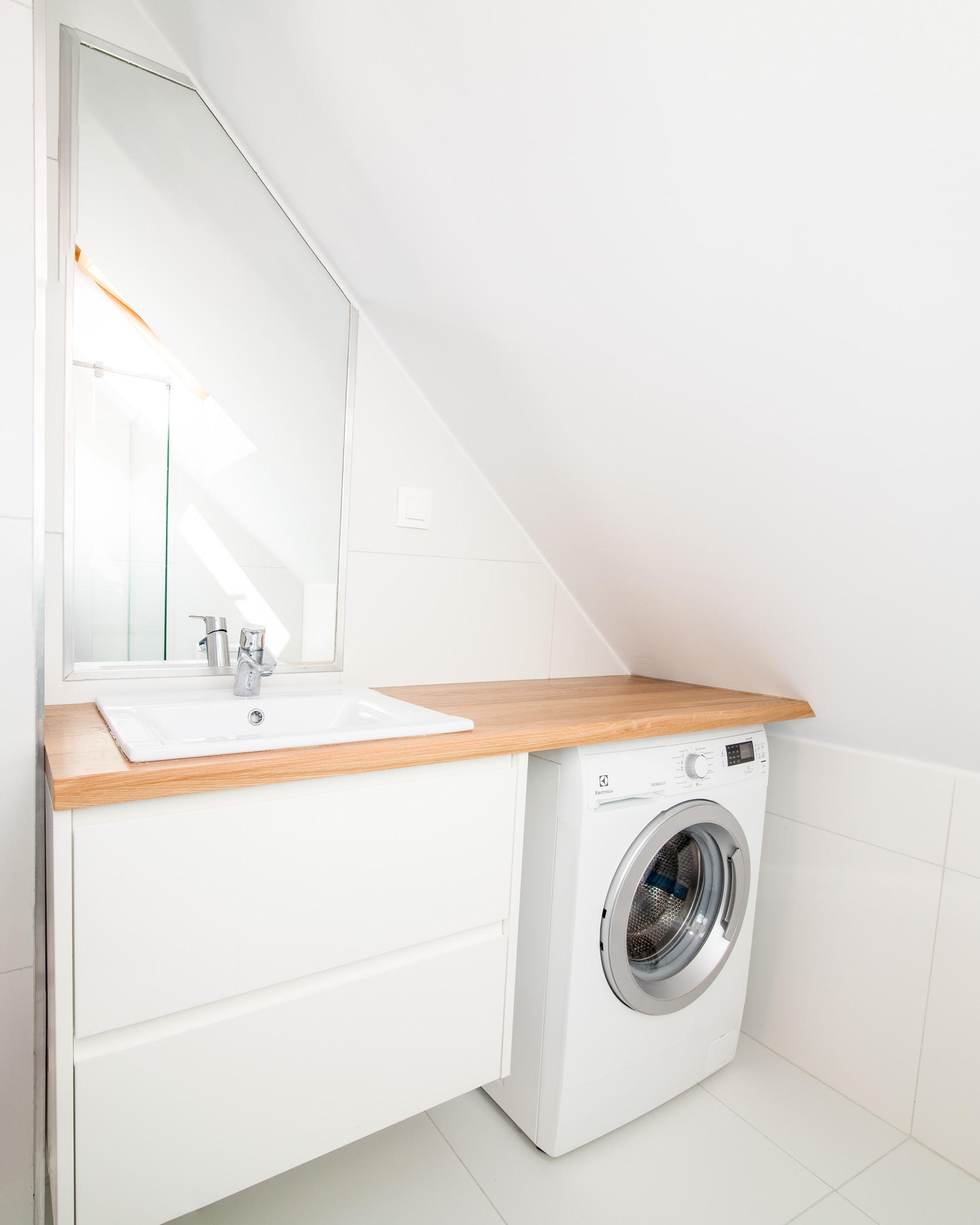 Łazienka: prysznic, szafka z szufladami, pralka, suszarka do włosów.