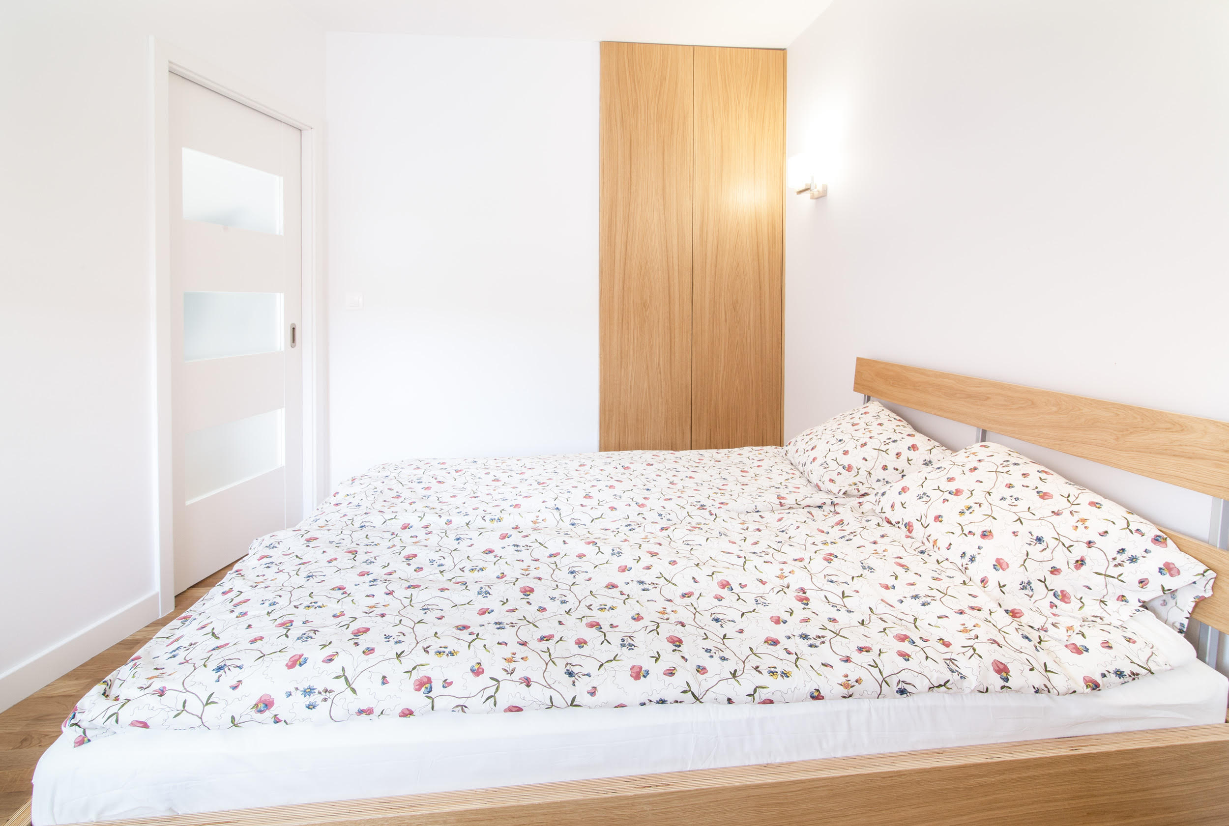 Sypialnia: podwójne łóżko z bardzo wygodnymi materacami, biurko, szafa wnękowa, telewizor z płatkim ekranem.
