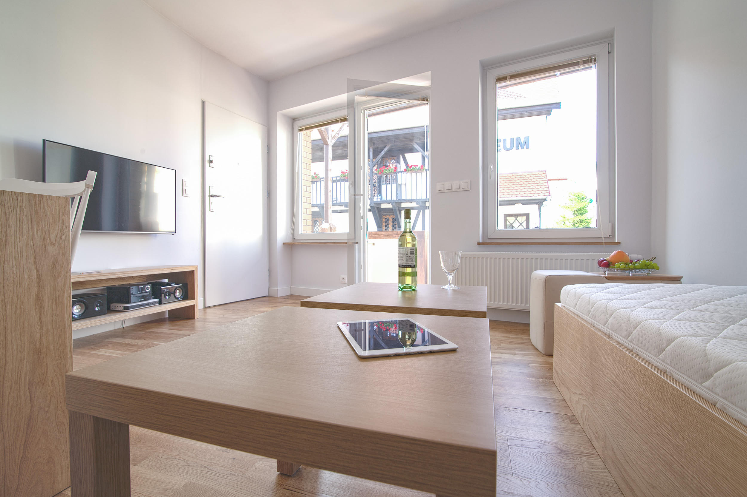 Apartament 43m na 1 piętrze obejmuje: sypialnię, przedpokój, salon z aneksem kuchennym oraz łazienkę. Do dyspozycji Gości szybki Internet oraz bogaty abonament TV. Nasze apartamenty wyposażone są w meble oraz sprzęty wysokiej jakości, co sprawi, że Państwa wczasy w Uzdrowisku Ustka będą niezapomnianym przeżyciem. Dla nas wczasy to nie tylko noclegi ale komfort i wygoda.
