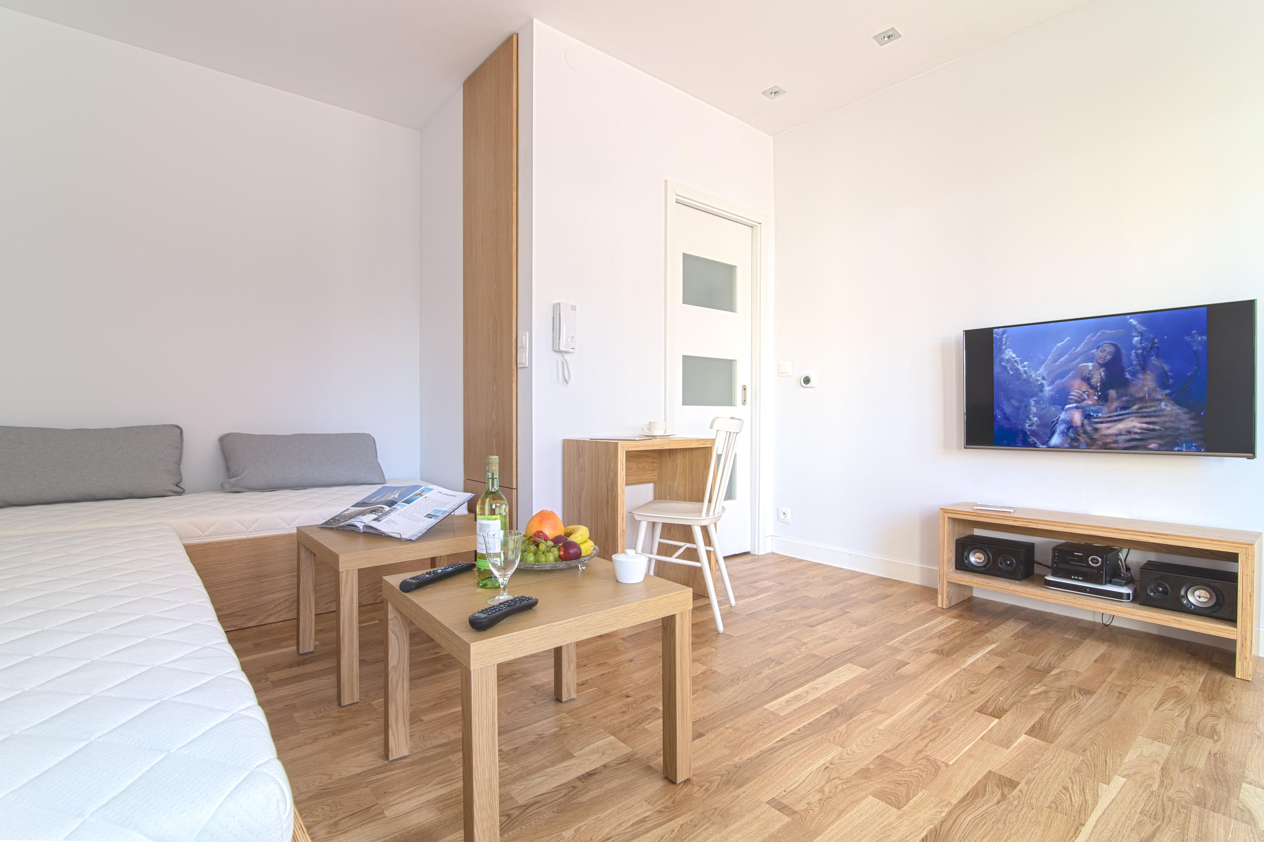 Salon: dwa łóżka pojedyncze z bardzo wygodnymi materacami, które w ciągu dnia pełnią funkcję wypoczynku, stolik kawowy, szafa wnękowa, stół z krzesłami, szafka RTV, telewizor z bogatą ofertą programów i podłączeniem do Internetu, odtwarzacz płyt DVD i CD, radio.
