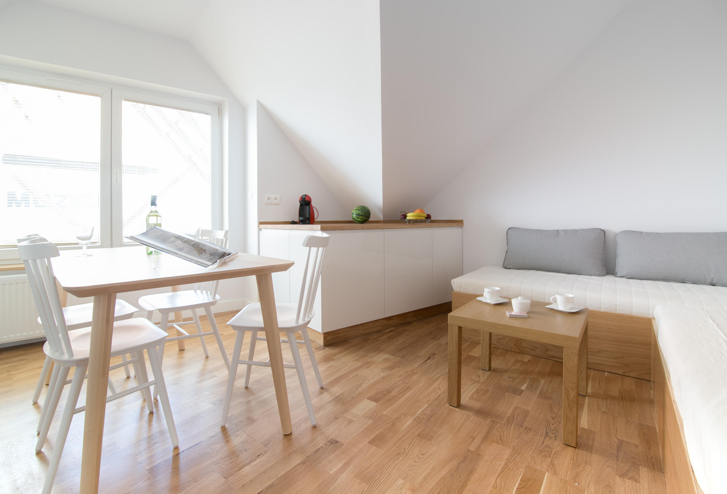 Aneks kuchenny wyposażony jest w płytę indukcyjną, lodówkę, zmywarkę, piekarnik, toster oraz ekspres do kawy. Do dyspozycji Gości zastawa stołowa sztućce, garnki, patelnie, naczynia i przybory zazwyczaj używane w kuchni.
